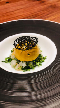 鹿児島産の薩摩赤エビの頭で出汁を取ったエビのムースと丘ひじきと海老の身のタルタルを合わせたアミューズです