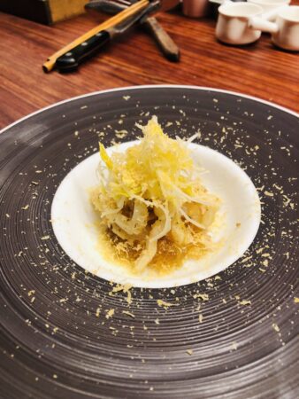 自家製生ハムで出汁を取ったコンソメのジュレにアオリイカとレンコンのマリネを合わせました。