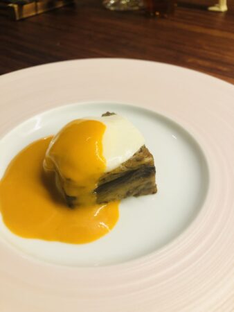 未分類|2025.11.11 秋ナスと羊のムサカ 秋ナスと羊の肩肉を低温で煮込んで茄子と羊を交互重ねてオーブンで焼いてたムサカと言う料理です 上にモッツァレラチーをのせてオーブンで温めてトマトクーリのソースをかけております 福岡市大手門ガリネット ビストロレストラン